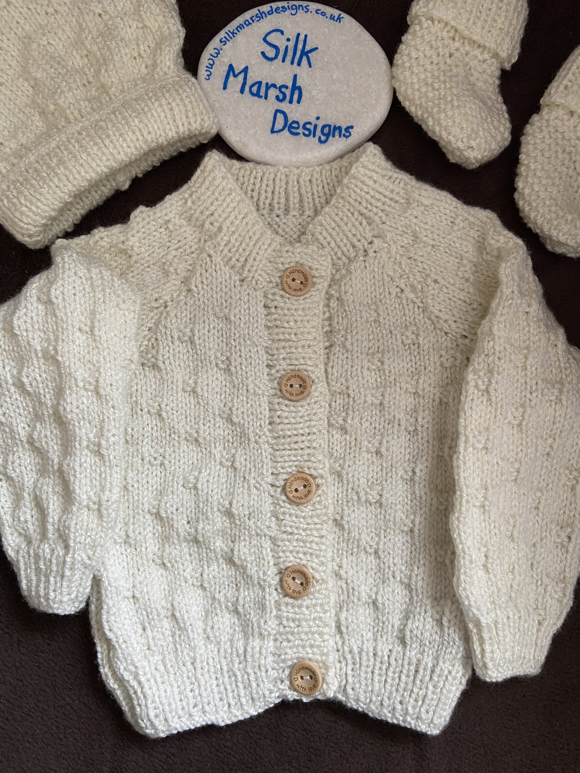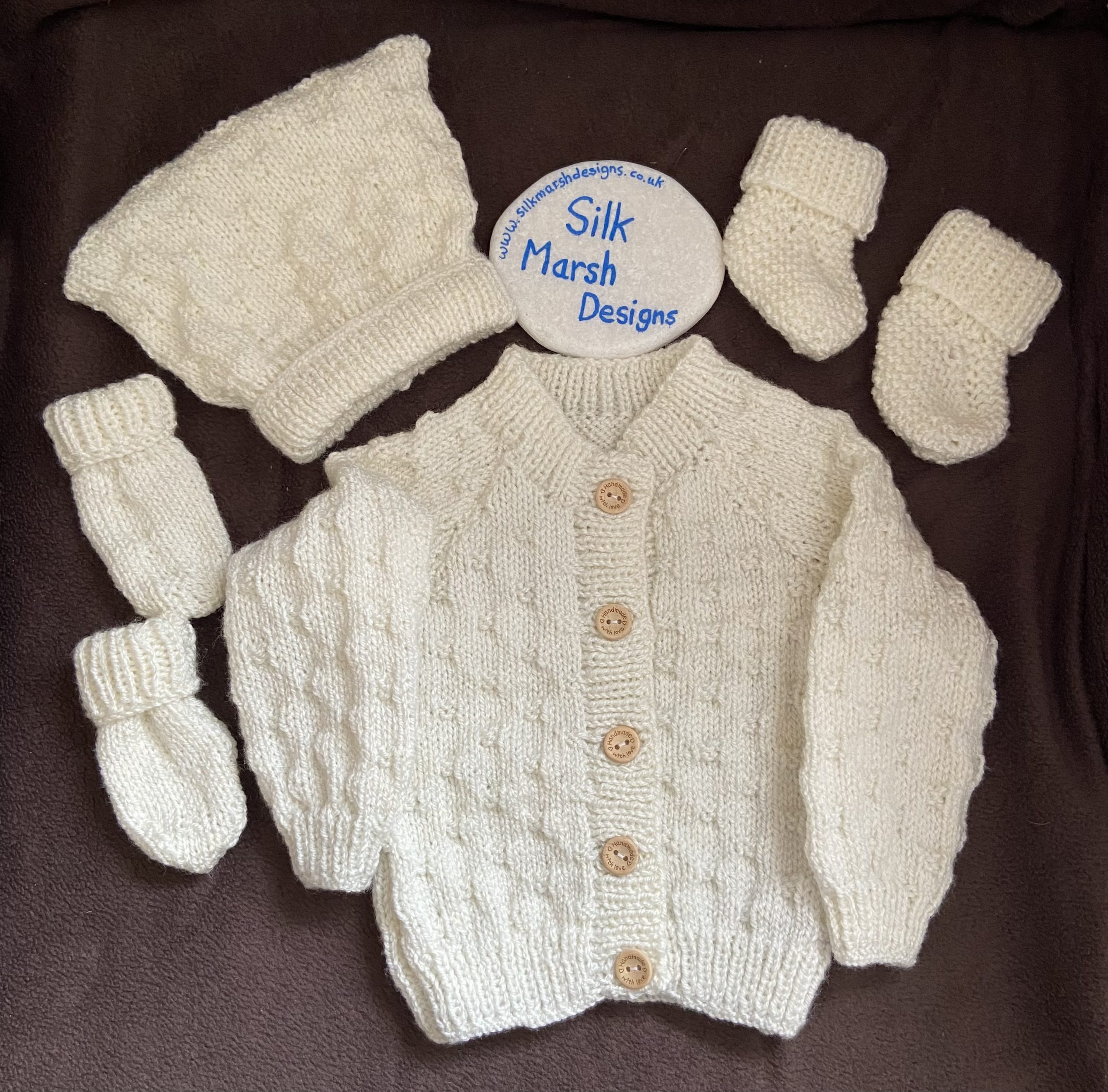 “CLEMMIE” Round-Neck Baby Cardigan with Hat, Mitts and Booties
