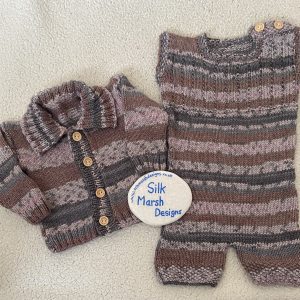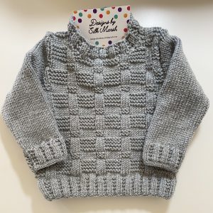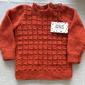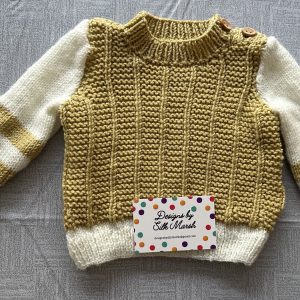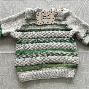 This comfy jumper is both practical and classic and would be suitable for everyday wear. The jumper is our Jacob design and is a round-neck easy knit project. Worked in stocking stitch with contrasting vertical stripes around the front and back and sleeves, which adds that special touch. The yarn used for this design was Stylecraft Baby DK in two contrasting shades. It has button bands to both shoulders but only the right side has button holes.