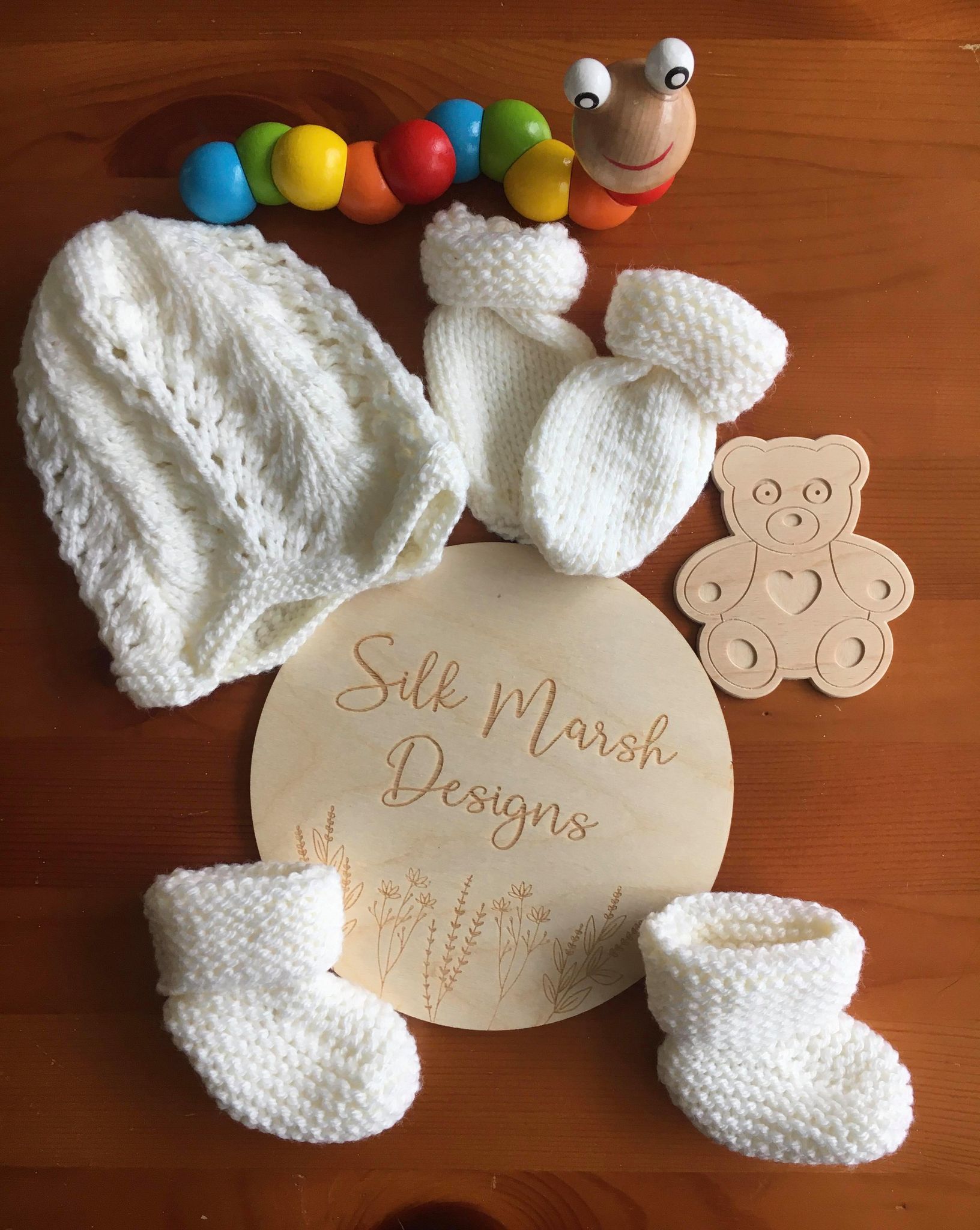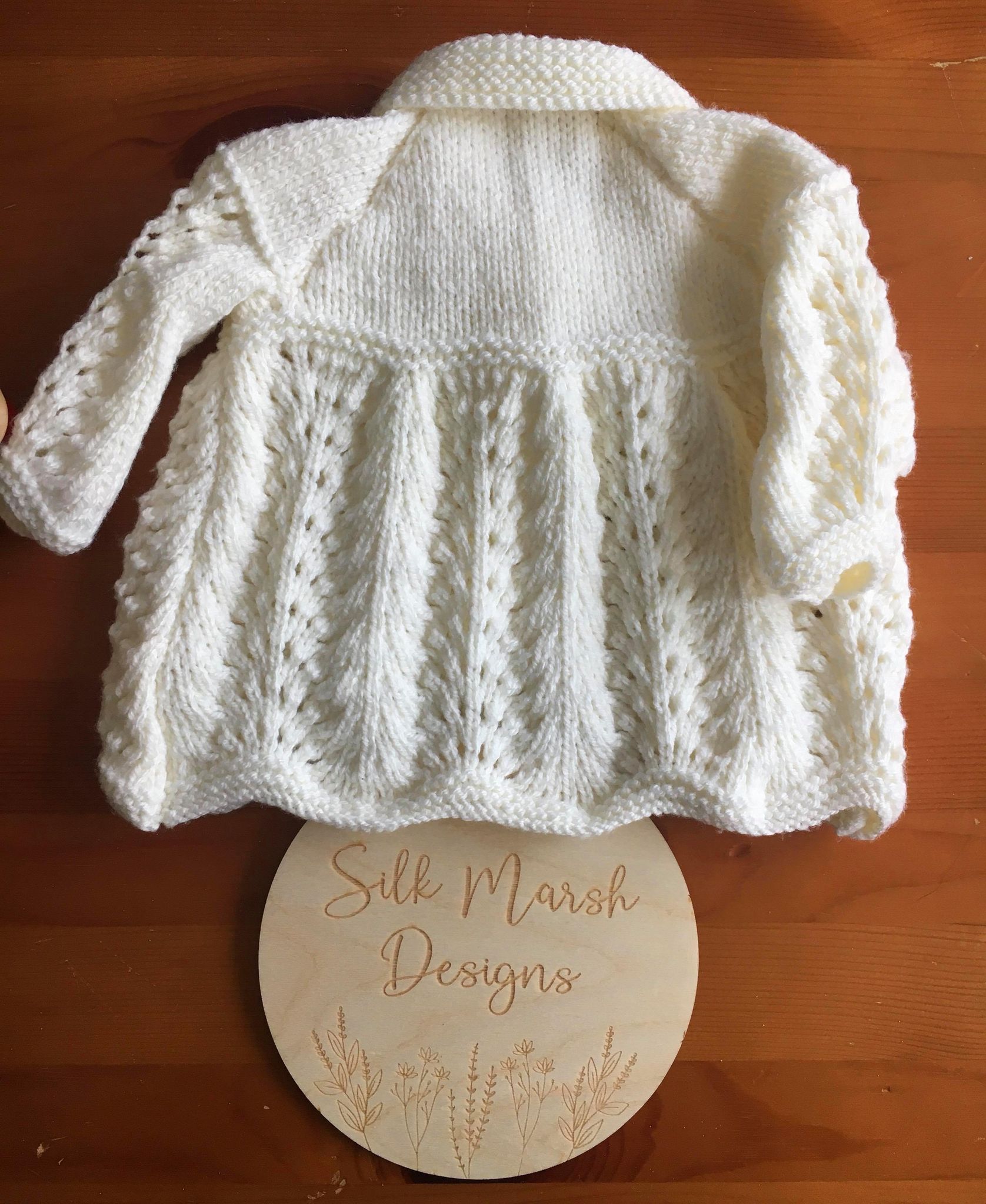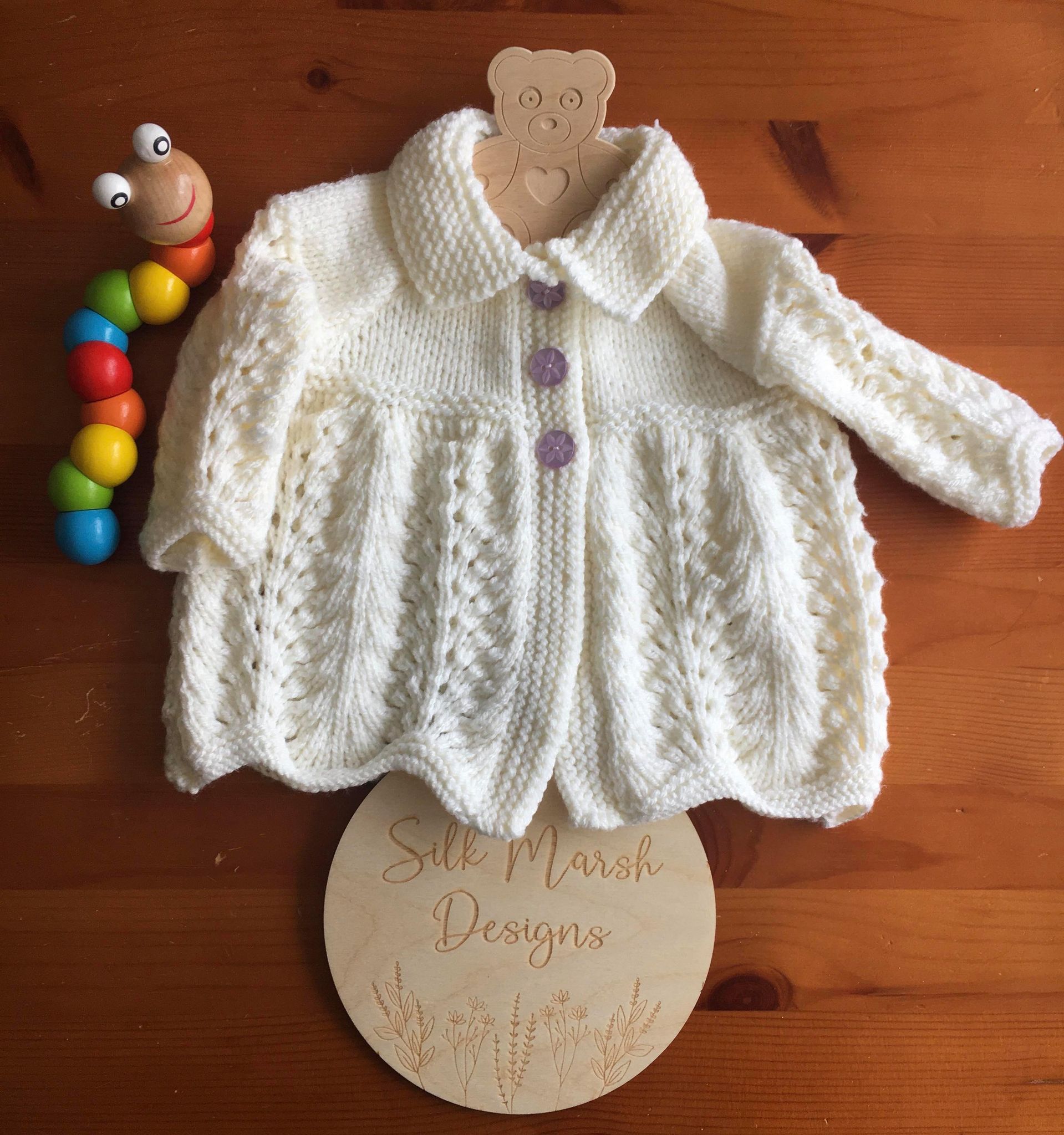 Our Margaret design is for a Matinee Jacket with a Hat, Mitts and Booties. This design was knitted in Hayfield Baby Bonus DK yarn.