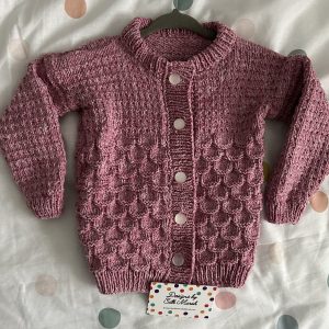 Our Myisha design is a jumper with a textured pattern to the front, and stocking stitch to the back and sleeves. It has button holes and the shoulders for ease of dressing. You will need some experience of knitting with patterns for this jumper. It has been knitted using DK yarn. It uses 3.25mm and 4mm knitting needles. It will fit age ranges 6-24 months, which is 18” and 20” chest sizes.