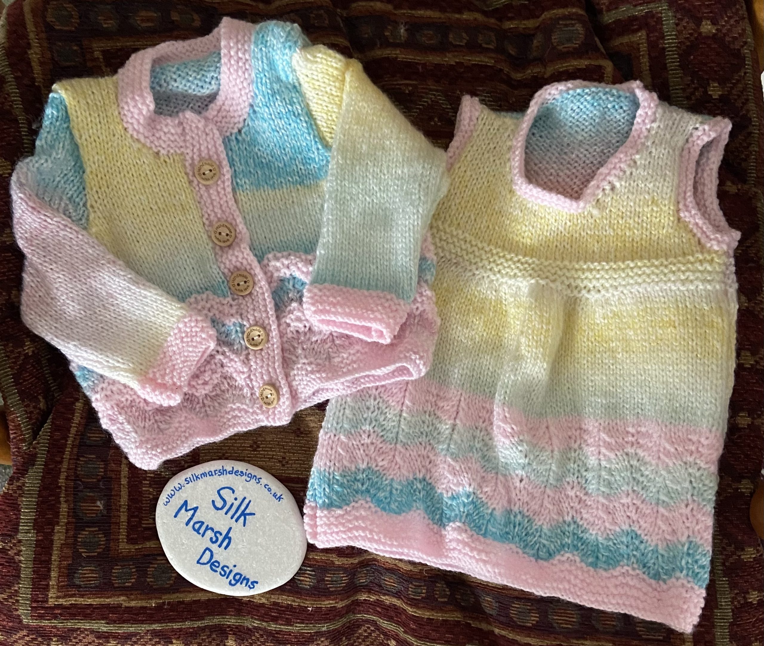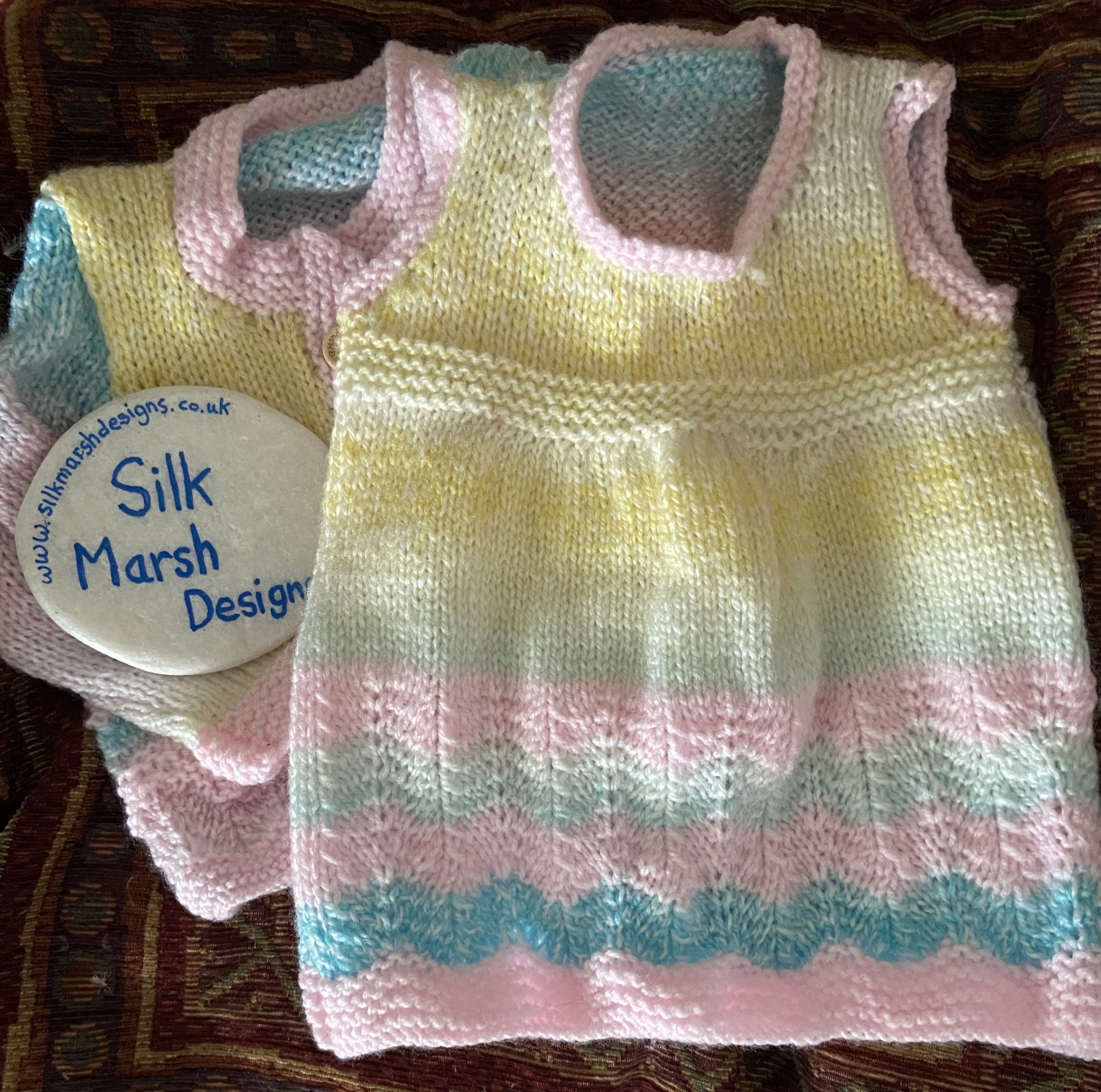 Our Natasha design is a girls Baby Knitting Pattern for a Round Neck Cardigan and Pinafore dress in 16-20” chest, approx ages Birth-12 months.